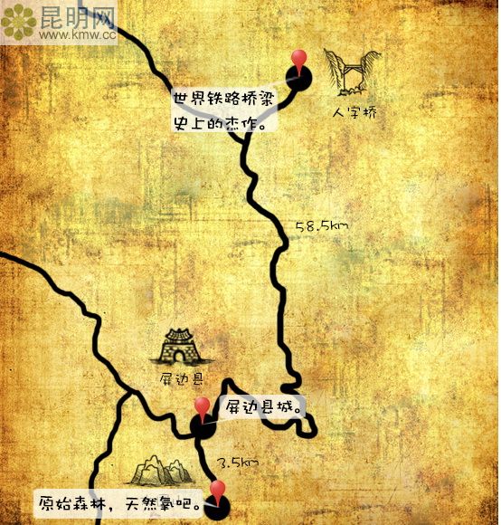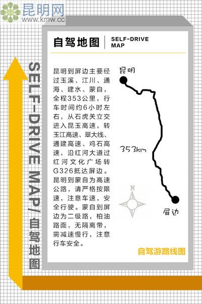 昆明到屏邊主要經(jīng)過玉溪、江川、通海、建水、蒙自,全程353公里,行車時間約6小時左右,從石虎關(guān)立交進入昆玉高速,轉(zhuǎn)玉江高速、翠大線、通建高速、雞石高速,沿紅河大道過紅河文化廣場轉(zhuǎn)G326抵達屏邊。昆明到蒙自為高速公路,請嚴格按限速,注意車速,安全行駛。蒙自到屏邊為二級路,柏油路面,無隔離帶,需減速慢行,注意行車安全。