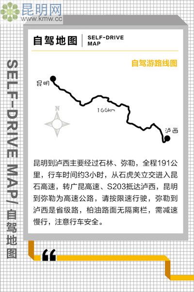 昆明到瀘西主要經過石林、彌勒,全程191公里,行車時間約3小時,從石虎關立交進入昆石高速,轉廣昆高速、S203抵達瀘西,昆明到彌勒為高速公路,請按限速行駛,彌勒到瀘西是省級路,柏油路面無隔離欄,需減速慢行,注意行車安全。