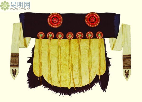 也叫云肩,多以絲緞織錦制作,納西人的七星披肩象征著納西婦女“肩擔(dān)日月,背負繁星”,以頌揚納西族婦女辛勤勞作之美德,由七枚小圓盤中心下吊的十四根麂皮細線,則表示日月星辰放射出的萬丈光芒,給人間帶來光明與溫暖。