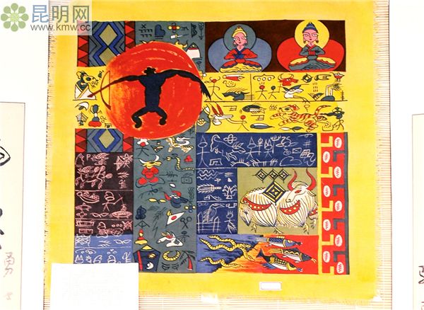 東巴掛毯采用當(dāng)?shù)貎?yōu)質(zhì)的細羊毛,精編細織而成,圖案為黑色羊毛繪制,以納西古老的東巴字畫和富有吉祥美好寓意的圖案構(gòu)成。