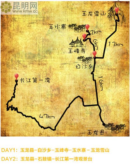 昆明到玉龍縣,約500公里,全程約8小時。途經(jīng)杭瑞高速G56——南澗路G320——214國道——大麗線S221。過路費165元。