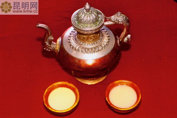 酥油茶是藏族人民日常生活不可缺少的必需品。制作時簡單方便:先用土茶倒入茶筒,加入酥油、鹽和精制和香料,用攪捧上下反復攪打成水乳交融狀,即可斟用。飲之,色香味美,回味無窮。