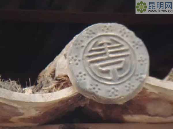 昆明地區“一顆印”式民居建筑的瓦當圖案多為花草紋,幾何紋,動物紋、漢字紋、回紋等。瓦當是屋面上覆蓋瓦縫的筒瓦其最下面一塊圓形的端頭裝飾,也稱“勾頭”。據考古調查資料顯示,瓦當早在西周晚期就出現了,到秦漢時已很常見。到隋唐時期,其紋飾圖案已較為豐富。明清時,瓦當藝術繼承了前人的多數圖案,但也隨著時代的發展演變了許多新的圖案,作為各地建筑中瓦當圖案又具有一定的地域特色。