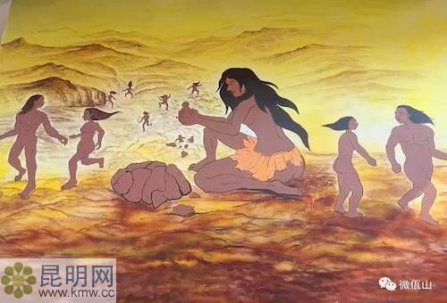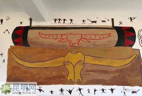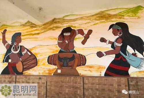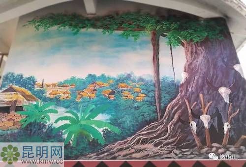 壁畫內(nèi)容豐富,畫上有古時佤族先民的生活、祭祀、村寨等圖案,還有現(xiàn)代佤族人民的耕種、戀愛、制作木鼓等,畫面生動,色彩艷麗。