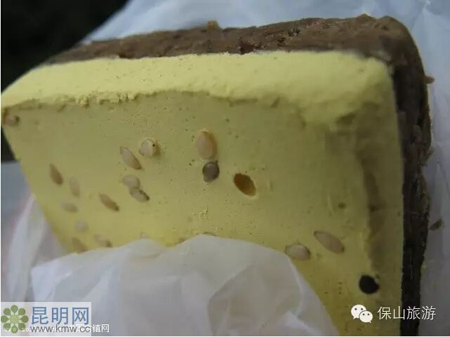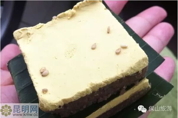 其實(shí)松花糕不是什么佳肴,而是一種采用天然的松花粉加紅豆做成的小吃(當(dāng)然也有用黃豆的)。松花粉被科學(xué)界譽(yù)為天然食品之冠,富于營(yíng)養(yǎng),其中蛋白質(zhì)含量為牛肉和雞蛋的七倍,而且以游離氨基酸的形式存在,易被消化吸收。它對(duì)各種疾病有奇妙的功能。常食某些花粉對(duì)貧血、腦功能紊亂、用腦過(guò)度和幼兒大腦遲鈍、毛細(xì)管強(qiáng)度不足等有療效。更有強(qiáng)筋健骨、增強(qiáng)勞動(dòng)耐力、增進(jìn)食欲和延年益壽的功能。松花糕,最上面一層是厚厚的黃色天然松花粉,松花粉上面撒有一些芝麻。下面一層褐紅色的是夾著紅豆碎塊的紅豆沙。再下一層黃色的松花粉和褐紅色的豆沙,最下面一層是制糕粉。騰沖當(dāng)?shù)厝说乃苫ǜ馐且话逡话宓刈龀鰜?lái)的,每一板大約30×60公分大小,再用小刀劃成3×3公分左右的小塊,每塊也就半公分多厚。它整整齊齊的擺在一只淺底的大木盒子里,上面用一張塑料薄膜蓋著。有食客買時(shí),攤主就會(huì)拿出一只小鋁皮鏟子,小心翼翼的鏟起幾塊。為了保證松花糕的新鮮,攤主每天只做一盒,賣完便回家,第二天再做再賣。