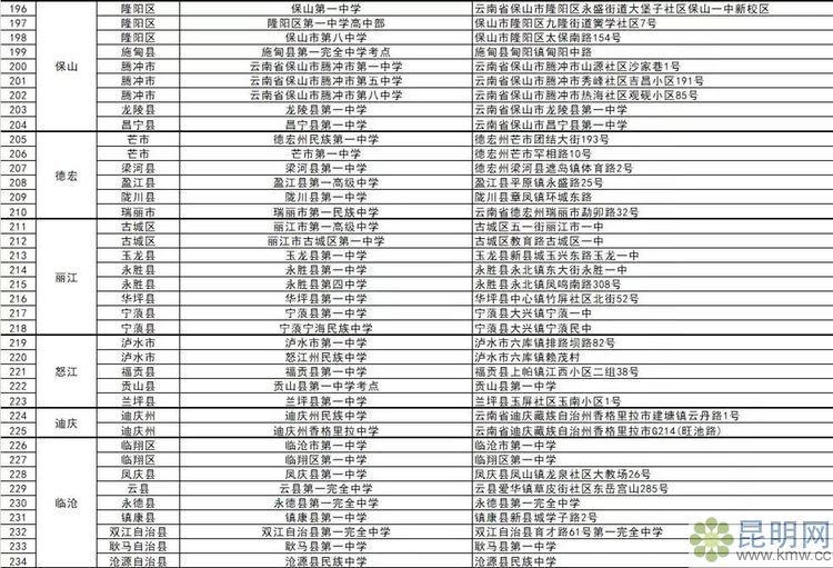 特別提醒,考生要仔細辨別考點學校名稱,提前確認考點位置,以免出現走錯考點、耽誤考試的情況發生。昆明各考點也將在考前1天開放,考生可提前到考點學校熟悉周邊道路、環境情況。考點具體如下: