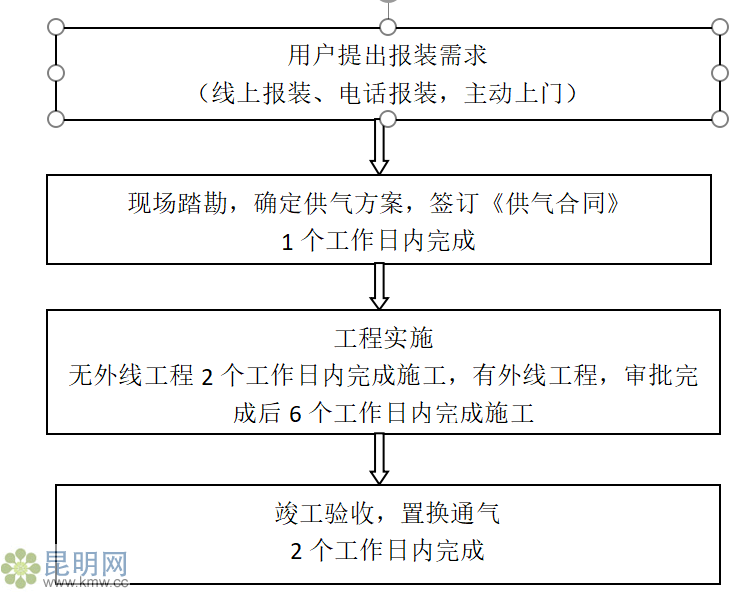 備注:小型非居民燃氣用戶報裝,無外線工程總耗時不超過5個工作日;有外線工程完成
